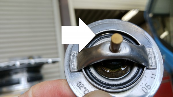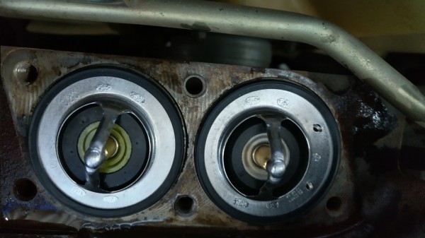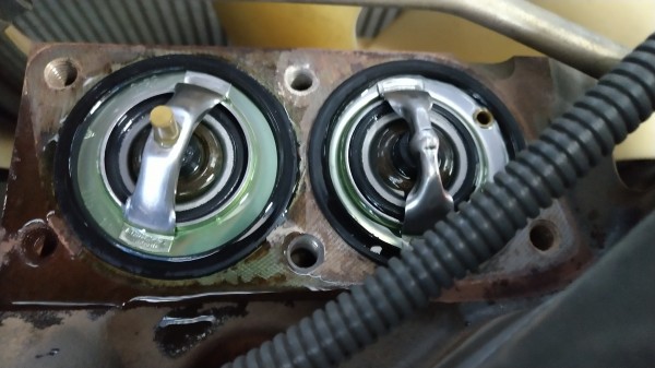 水温が上がらないとDPD再生モードに入りませんので、原因を探します。冷却水の温度調整のサーモスタットを外して、確認です。