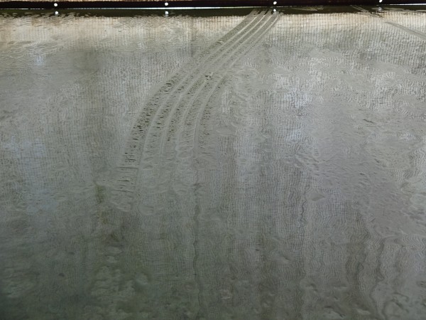 交換作業が終わって、ピットから出した後に床に水を撒くと・・・。タイヤの跡ではじいています。