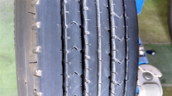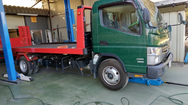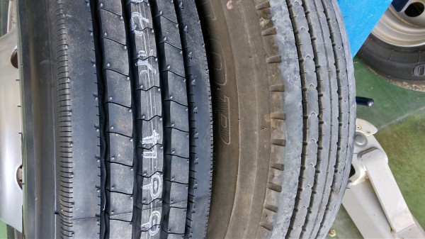 積載車のキャンター、フロントタイヤ交換です。このサイズはとても重い。タイヤチェンジャーに載せるのも一苦労です。