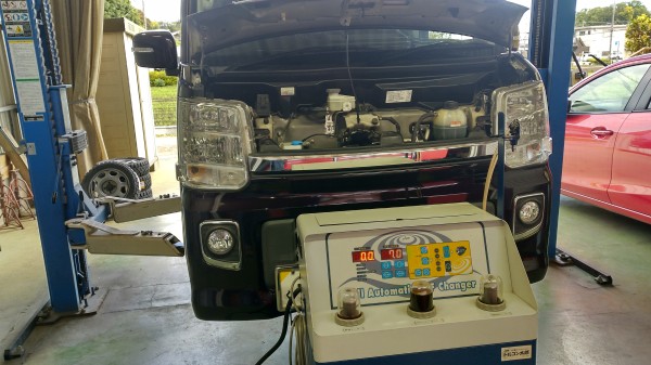 仕事で常に荷物満載の車はATの負担も大きいです。今回は6万キロになったのでトルコン太郎での圧送交換をしました。20L使用です。
